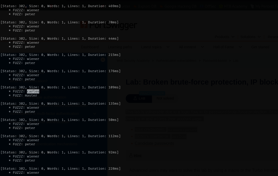 Fail (Carlos) -> Fail (Carlos) -> Fail (Carlos) -> Success (Wiener). I noticed that the counter reset, allowing me to tryCarlosagain immediately without being blocked. - Preparation:
