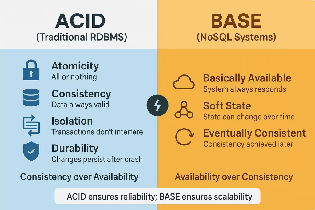 - NoSQL typically relies on BASE (Basically Available, Soft State, Eventual Consistency).